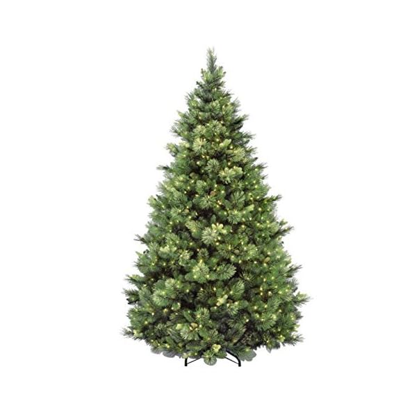 The Carolina Pine features an attractive array of cashmere and bristle branch tips. Trimmed with pre-strung clear lights and flocked pine cones, this tree with its hinged branch construction goes up fast, leaving more time for holiday cheer. 59″ diameter at base, includes metal tree stand.
