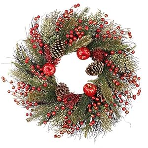 Aonewoe 24 Inch Christmas Wreath with Red Berry Pine Cone Gold Apple Round Natural Wreath for Front Door Home Decoration
