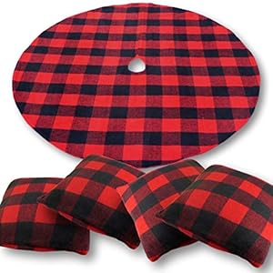 ATLIN Christmas Bundle – Buffalo Plaid Tree Skirt with 4 Cushion Covers – Larger 3 Inch Red and Black Checks for a Traditional Look – Machine Wash and Dry – 36 Inch Skirt and 18 Inch Cushion Covers